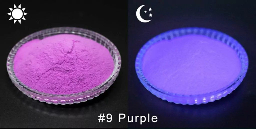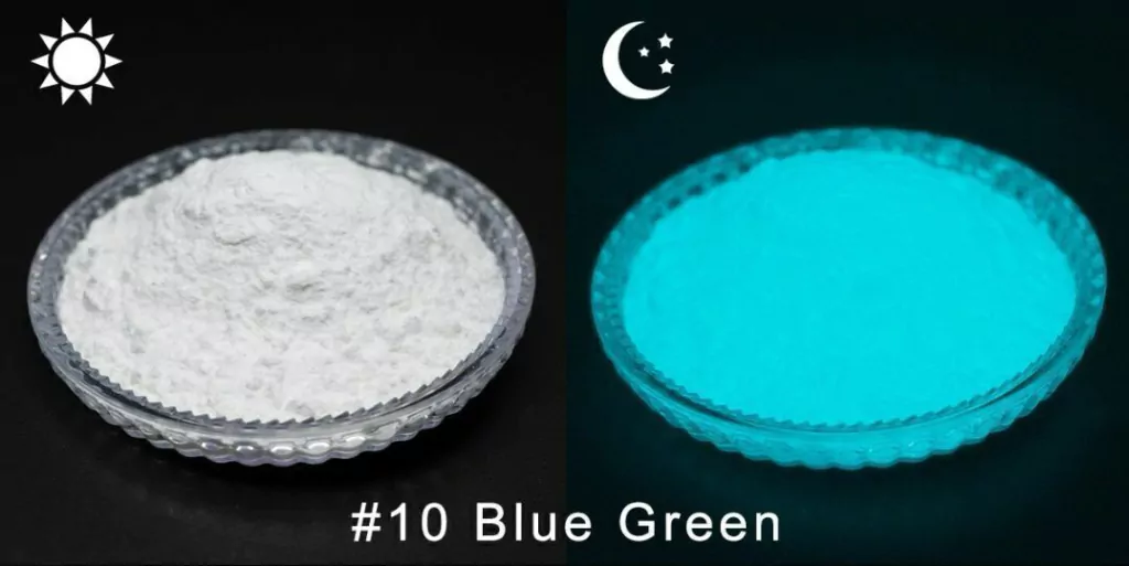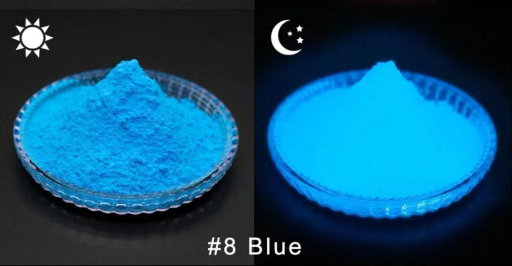Polvo luminiscente o Glow in the Dark que brilla en la oscuridad, capaz de recoger energía de la luz y almacenarla durante un tiempo haciéndola brillar por si sólo durante horas, incluso cuando la fuente de luz está apagada.